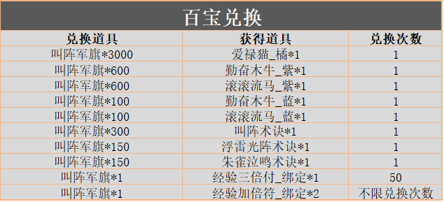 【活动内容】:活动期间,商城内购买「雷炎叫阵礼盒」,开启后可以获得「叫阵军旗」,使用该道具可以前往「百宝兑换」页面兑换以下道具:
