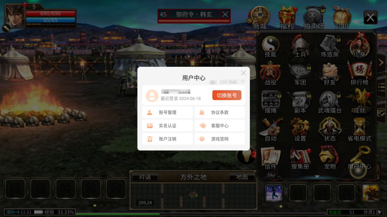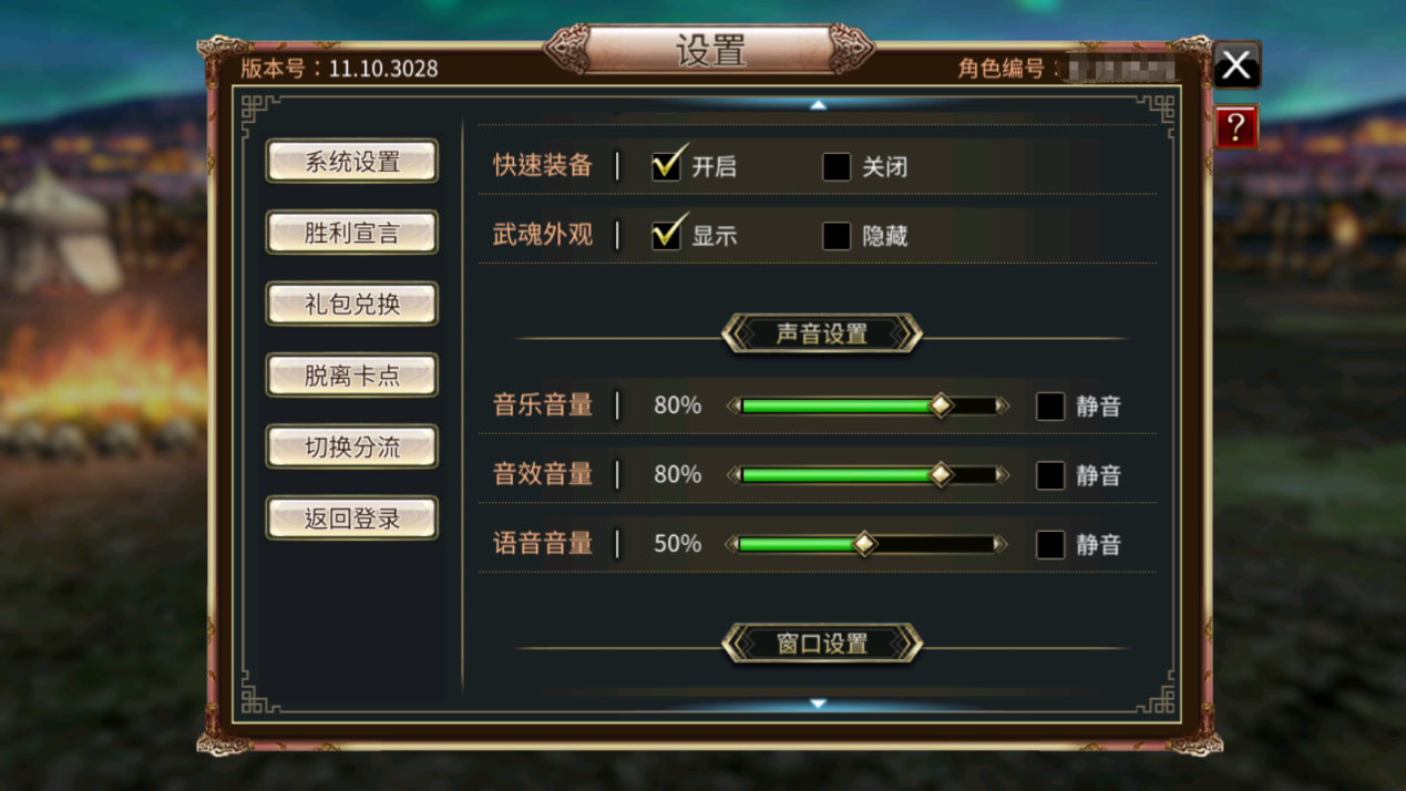 点击右上角的“菜单”按钮,在弹出的菜单栏中点击齿轮状的“设置”按钮,即可打开系统设置页面,进行画面、游戏、声音、窗口等各种设置。还可以设置胜利宣言、兑换礼品、切换分流、返回登录界面等。
