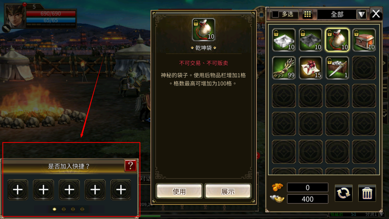 打开背包,选择可使用的道具,再点击左下角的物品快捷栏位,即可将该物品放入物品快捷栏,方便使用。