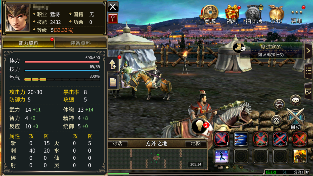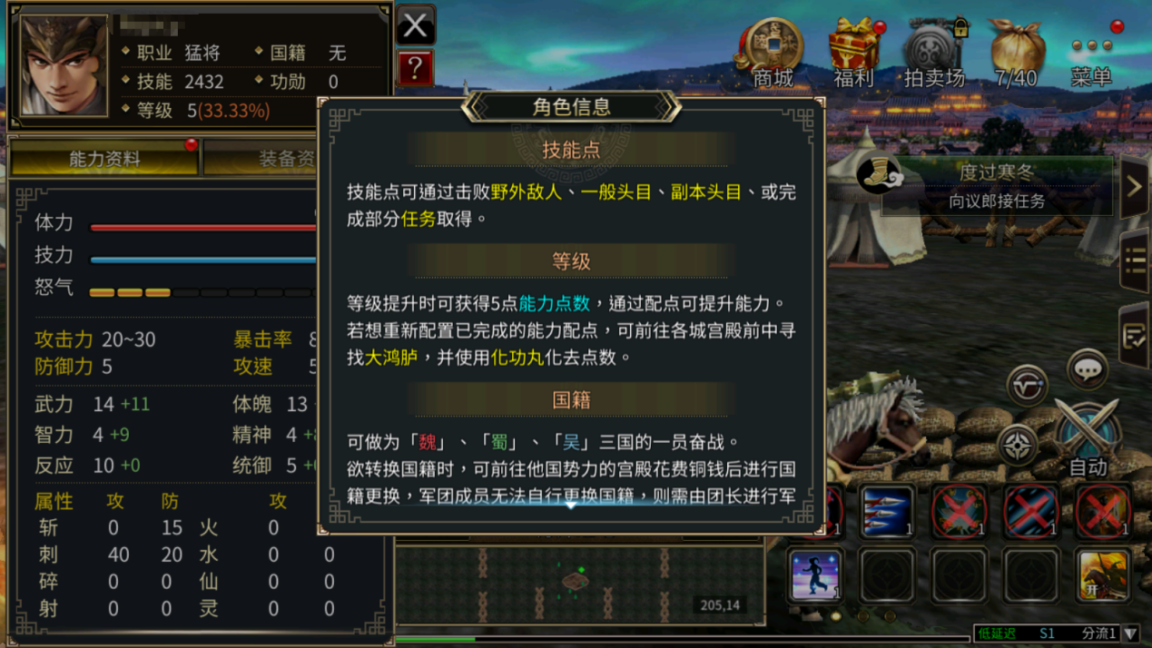 点击游戏左上角的角色头像,即可查看角色页面,可在页面中的“能力资料”查看角色现有的各项能力,在“装备资料”中查看目前的装备及装备属性。点击页面右侧的箭头状按钮,即可弹出加点页面,为角色分配各项属性点。