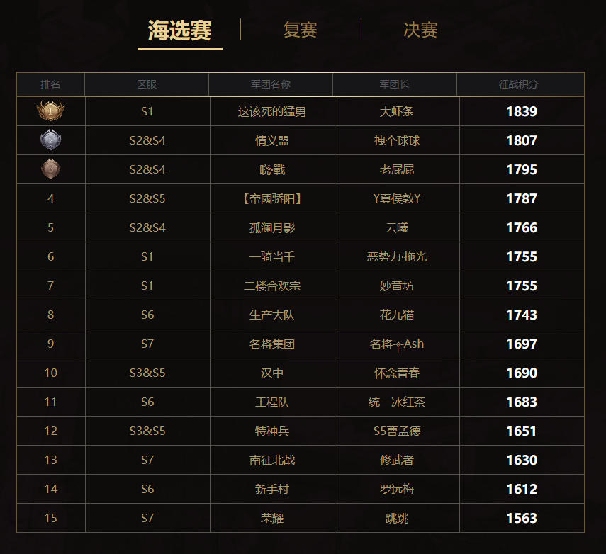 恭喜各位入围参与海选赛的军团!以下为海选赛最终排名结果: