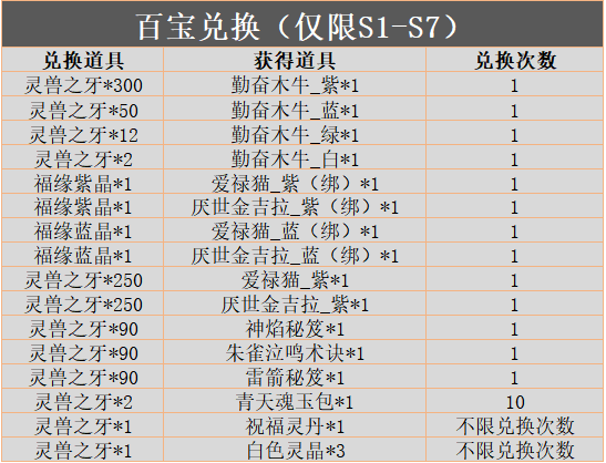 【活动内容】(仅限S1-S7):活动期间,参与幸运转盘有概率获得兑换道具「福缘紫晶」、「福缘蓝晶」、「灵兽之牙」,使用兑换道具可前往「百宝兑换」兑换以下道具: