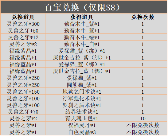 【活动内容】(仅限S8):活动期间,参与幸运转盘有概率获得兑换道具「福缘紫晶」、「福缘蓝晶」、「灵兽之牙」,使用兑换道具可前往「百宝兑换」兑换以下道具: