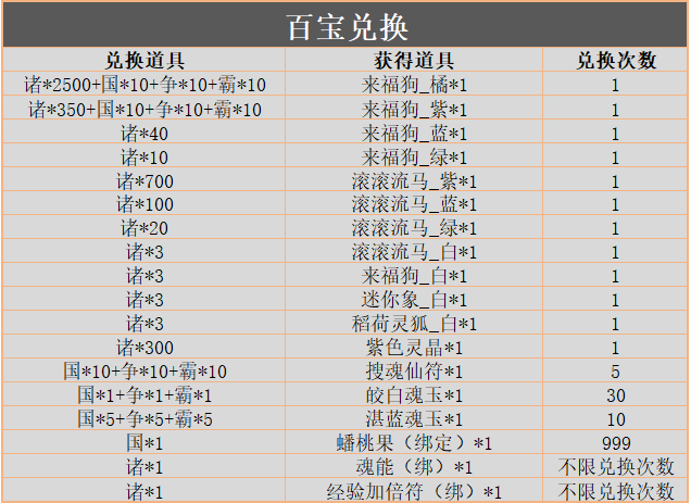 道具可以前往「百宝兑换」页面兑换以下道具: