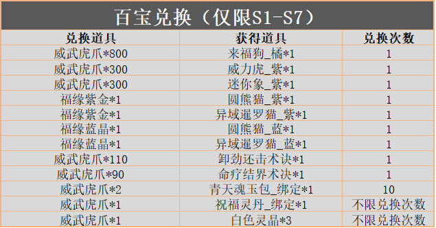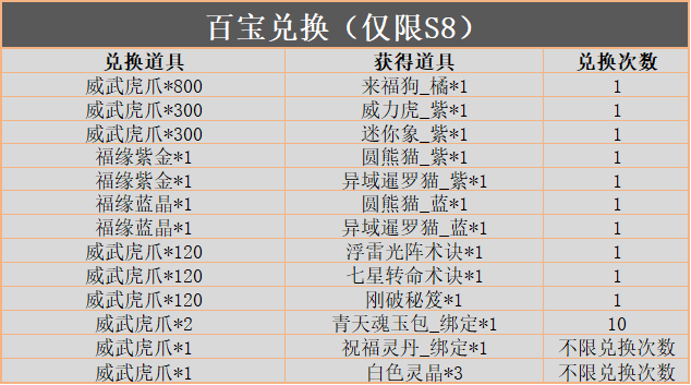 【活动内容】:活动期间,参与幸运转盘有概率获得兑换道具「福缘紫晶」、「福缘蓝晶」、「威武虎爪」,使用兑换道具可前往「百宝兑换」兑换以下道具: