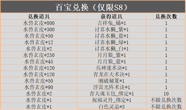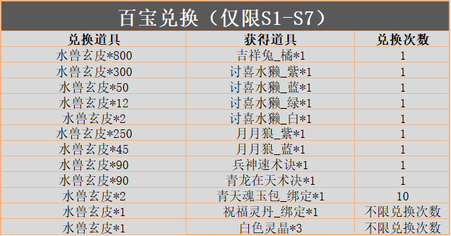 【活动内容】:活动期间,参与幸运转盘有概率获得兑换道具「水兽玄皮」,使用兑换道具可前往「百宝兑换」兑换以下道具: